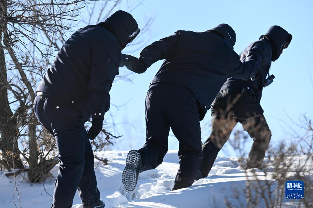 1月9日,西烏珠穆沁旗公安局古日格斯臺國家級自然保護區迪彥派出所民警在林區雪地相互搭手前進(jìn)。