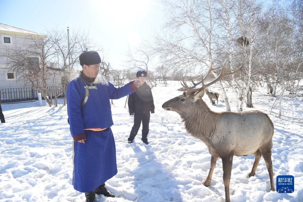 1月9日,西烏珠穆沁旗公安局古日格斯臺國家級自然保護區迪彥派出所民警王東濤(右)看望牧民(左)救助的馬鹿。