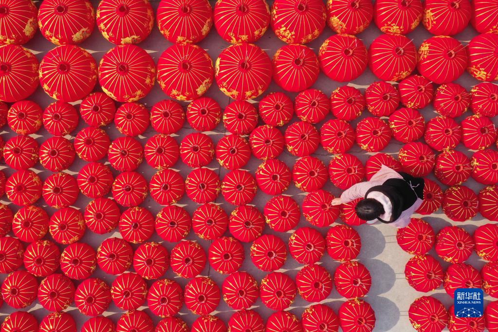 1月10日,焦作市溫縣趙堡鎮趙堡村一家燈籠作坊的工人在晾曬紅燈籠。