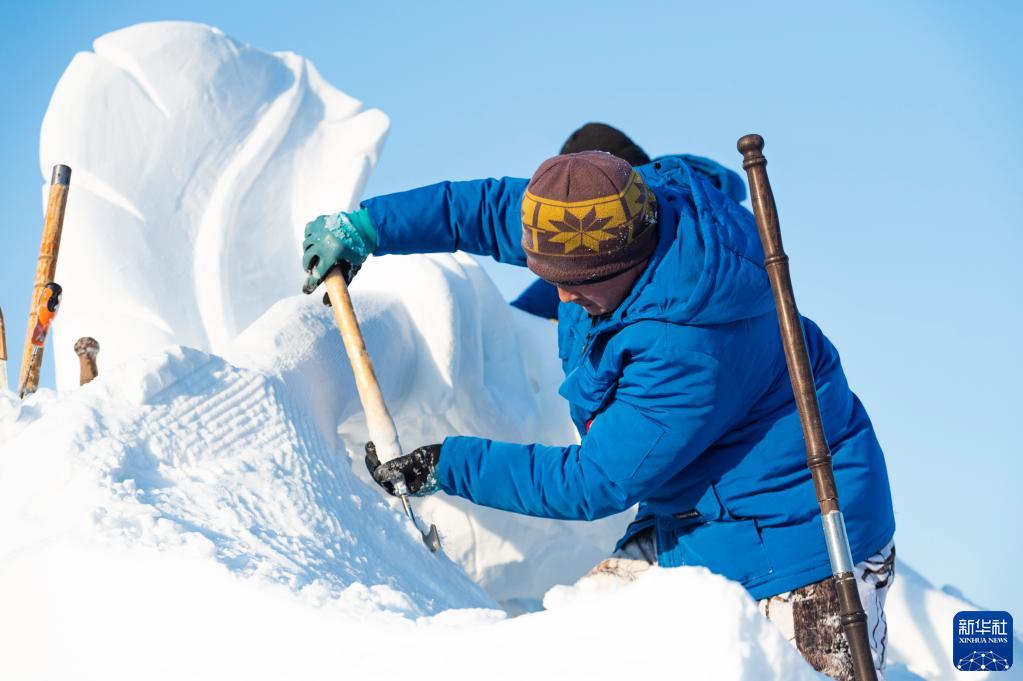 1月10日,在哈爾濱太陽(yáng)島雪博會(huì )園區,參賽選手進(jìn)行雪雕創(chuàng )作。