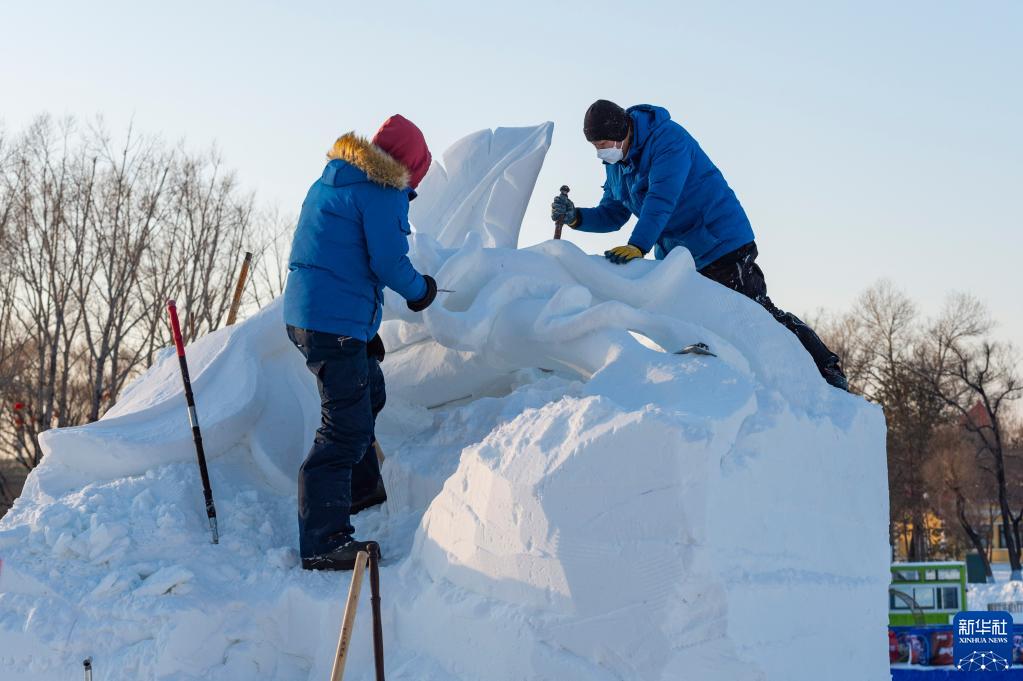 1月10日,在哈爾濱太陽(yáng)島雪博會(huì )園區,參賽選手進(jìn)行雪雕創(chuàng )作。