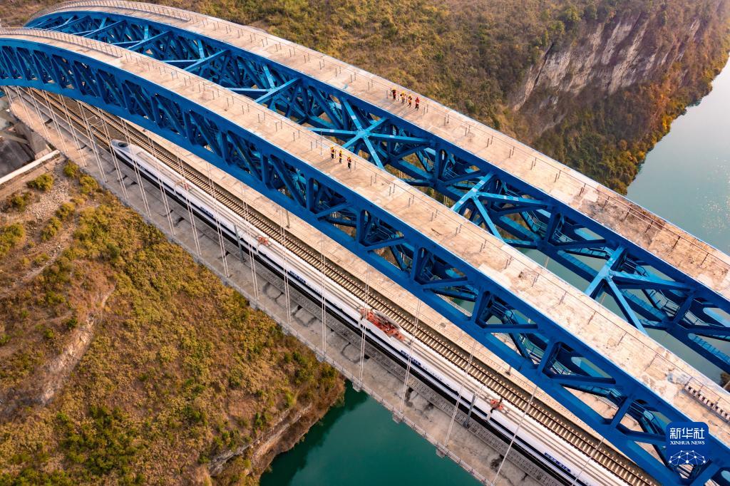 成貴高鐵鴨池河特大橋橫跨貴州省黔西市境內的鴨池河,在地勢險峻的峽谷間,每天約有100多組春運動(dòng)車(chē)穿行經(jīng)過(guò)。在最高處距離河面約277米的大橋上,鐵路職工堅守崗位,嚴格巡檢,對大橋的鋼結構、供電設備、橋梁支座、外包混凝土等進(jìn)行細致檢查,根據列車(chē)運行情況調整軌道線(xiàn)路的幾何尺寸、進(jìn)行鋼軌探傷等作業(yè),全力保障春運期間動(dòng)車(chē)組安全通過(guò)。