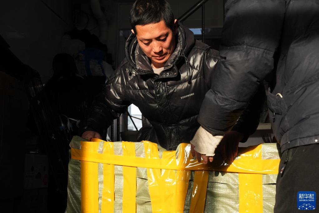 1月10日,東極魚(yú)市里小張魚(yú)行的老板張云浩在打包魚(yú)品準備發(fā)貨。