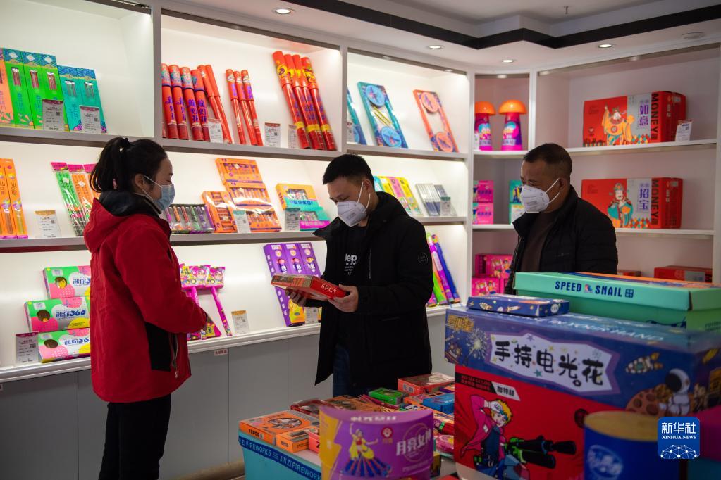 1月11日,在瀏陽(yáng)市大瑤鎮一家花炮銷(xiāo)售中心,工作人員(右)向顧客介紹花炮。