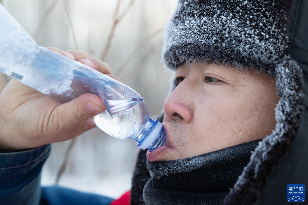 1月9日,線(xiàn)路設備運維人員馬國軍在巡線(xiàn)路上喝水休息。新華社記者 張濤 攝
