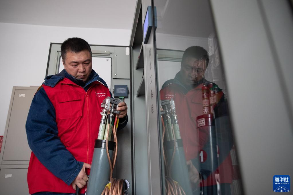 1月9日,在北極村供電所設備間內,線(xiàn)路設備運維人員馬國軍在檢查設備。新華社記者 張濤 攝
