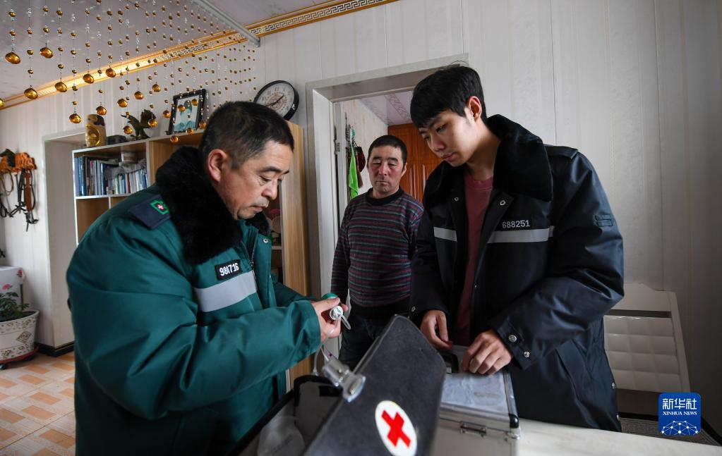 1月7日,姚春明(左)和同事(右)前往牧民家巡診。