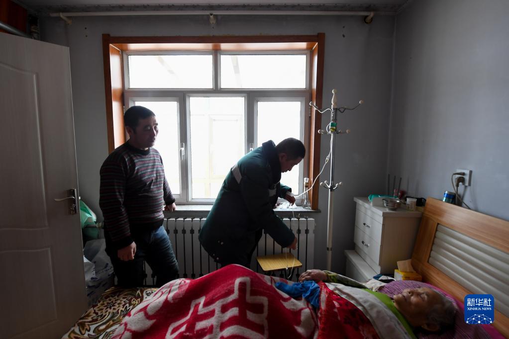 1月7日,姚春明(中)在牧民家為高齡老人治病。