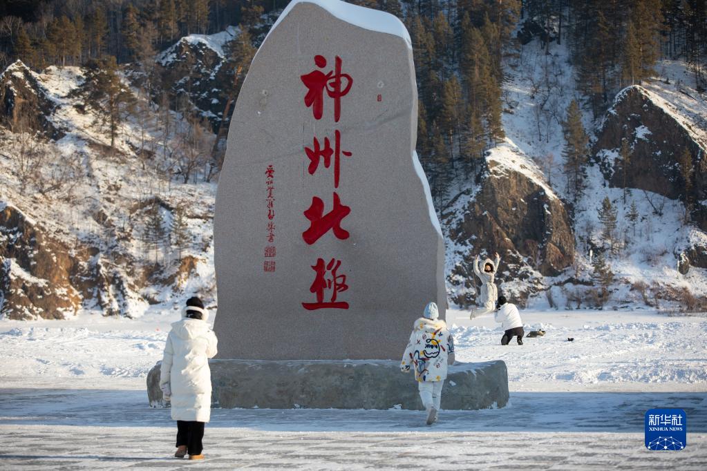 1月10日,在黑龍江省漠河市北極村神州北極廣場(chǎng),游客拍照留念。