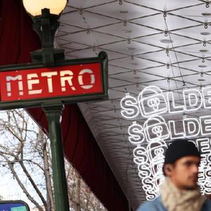 1月11日,一名女子走過(guò)法國巴黎街頭的打折季廣告。