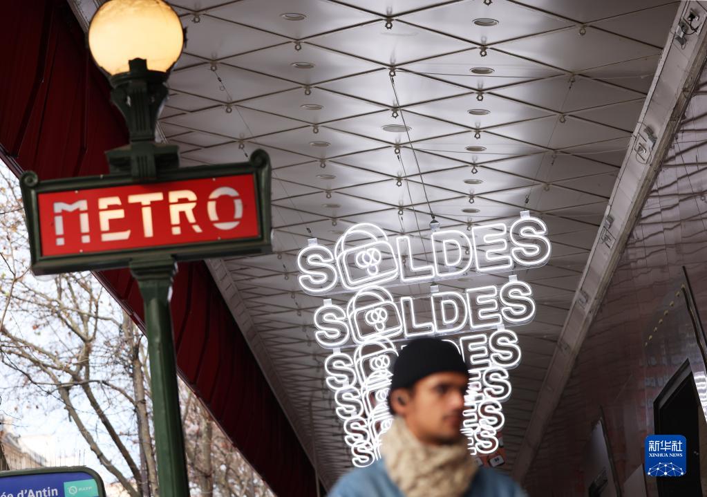 1月11日,一名男子走過(guò)法國巴黎街頭的打折季廣告。
