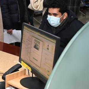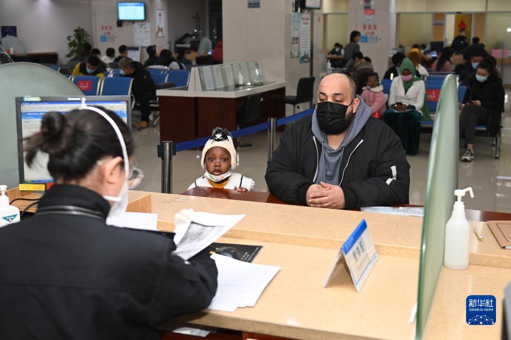 1月11日,外國客商在義烏市公安局出入境管理局辦事大廳辦理業(yè)務(wù)。