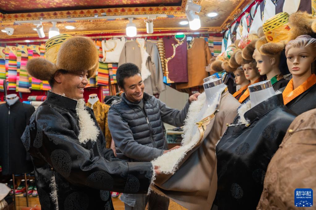 在拉薩八廓街周邊的老城區,人們在挑選藏裝(1月11日攝)。