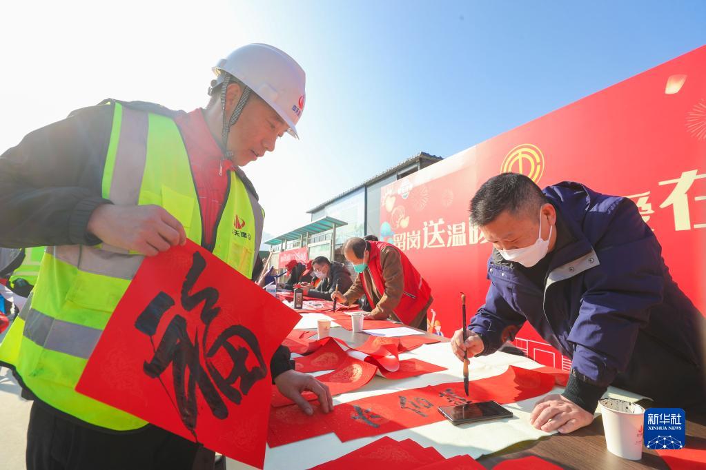 1月12日,在浙江省湖州市德清縣一處建設工地,書(shū)法愛(ài)好者為工友寫(xiě)春聯(lián)和福字。