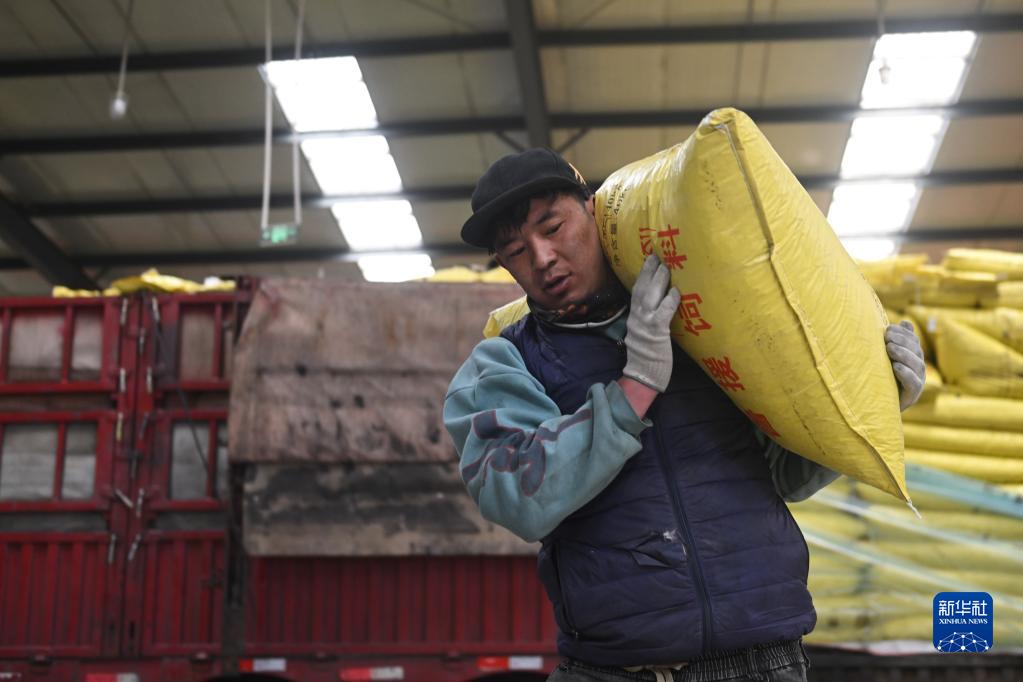 1月12日,青海省剛察縣一家飼料生產(chǎn)企業(yè),工作人員在搬運成品飼料。