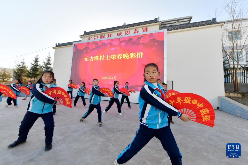 1月10日,在元古堆村村民廣場(chǎng),學(xué)生們在排練春晚的節目。