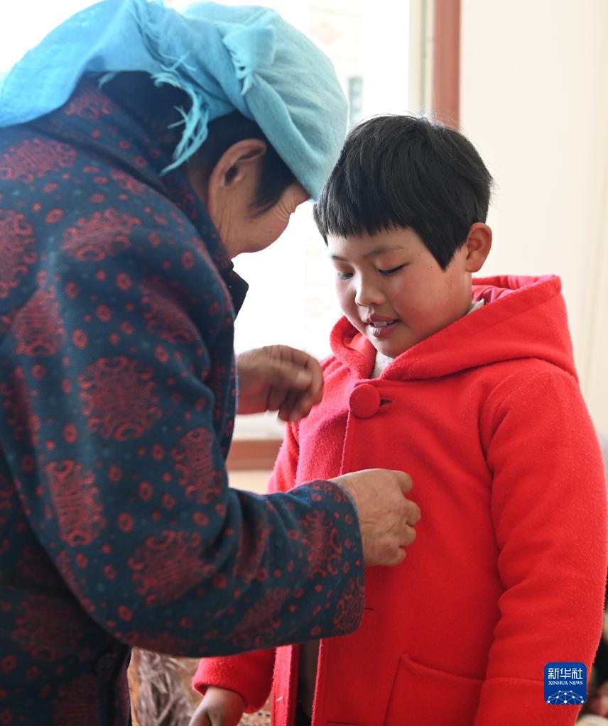 1月12日,元古堆村的孩子在試穿新衣。