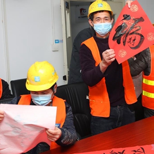 當日,在中建二局華東公司上海談家橋項目工地,來(lái)自談家橋社區的書(shū)法愛(ài)好者為工人師傅們現場(chǎng)寫(xiě)春聯(lián)和福字,送上春節祝福。