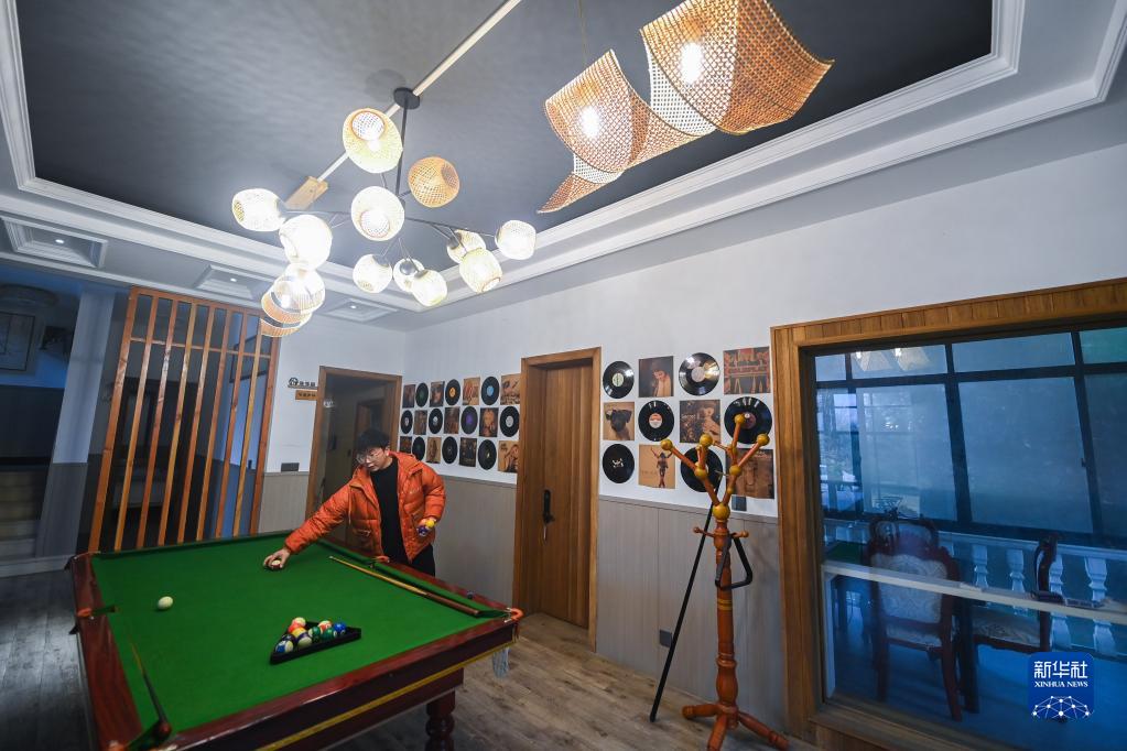 1月13日,在浙江省杭州市臨安區太湖源鎮橫徐村,呂康在自己開(kāi)辦的民宿里整理臺球桌。
