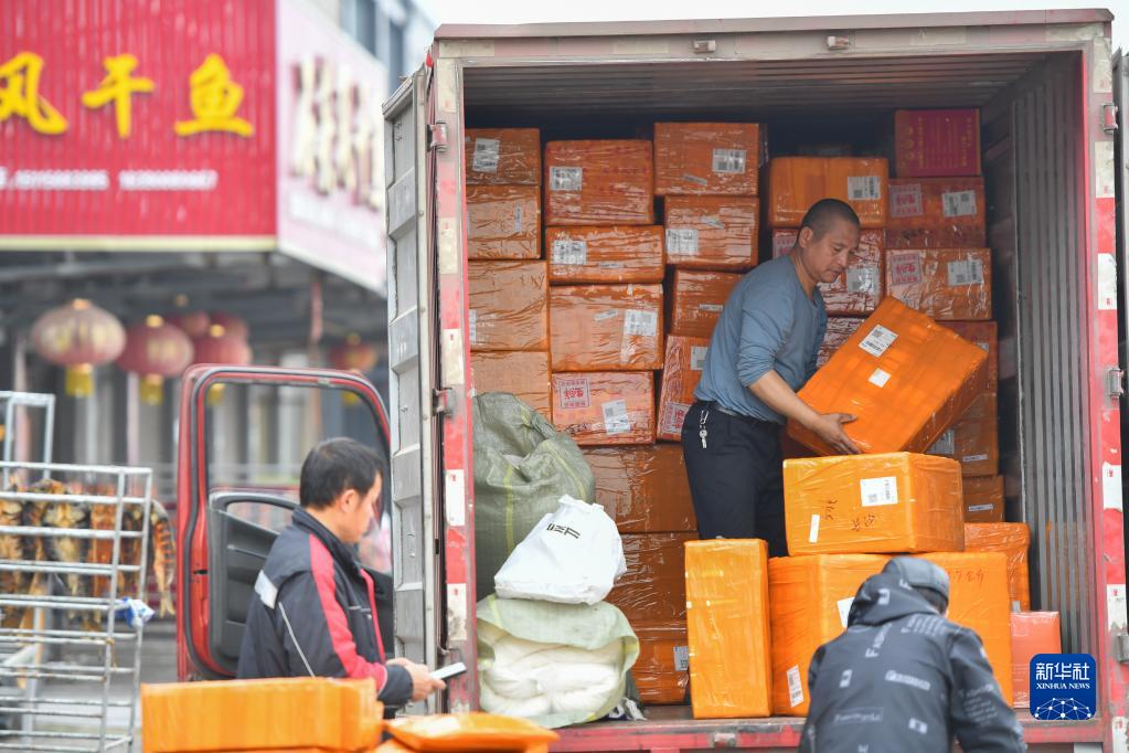 在岳陽(yáng)市君山區錢(qián)糧湖鎮六門(mén)閘社區生態(tài)漁村,物流工作人員將打包好的風(fēng)干魚(yú)裝車(chē)(1月12日攝)。