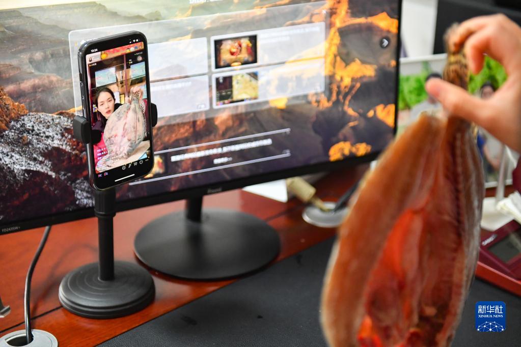 1月13日,在岳陽(yáng)市君山區錢(qián)糧湖鎮六門(mén)閘社區生態(tài)漁村,居民在直播銷(xiāo)售風(fēng)干魚(yú)。