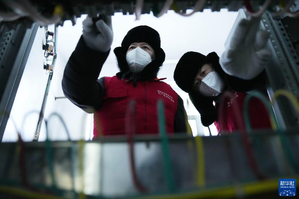 1月11日,國網(wǎng)撫遠市供電分公司抓吉供電所所長(cháng)白樺先(左)和工友費義偉在查看當地一家供熱企業(yè)的用電設備運行情況。