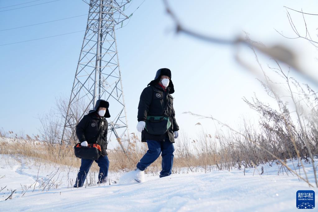 1月12日,國網(wǎng)撫遠市供電分公司抓吉供電所所長(cháng)白樺先(右)和工友費義偉在巡視東極線(xiàn)。