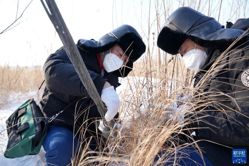 1月12日,國網(wǎng)撫遠市供電分公司抓吉供電所所長(cháng)白樺先(左)和工友費義偉在巡視東極線(xiàn)。