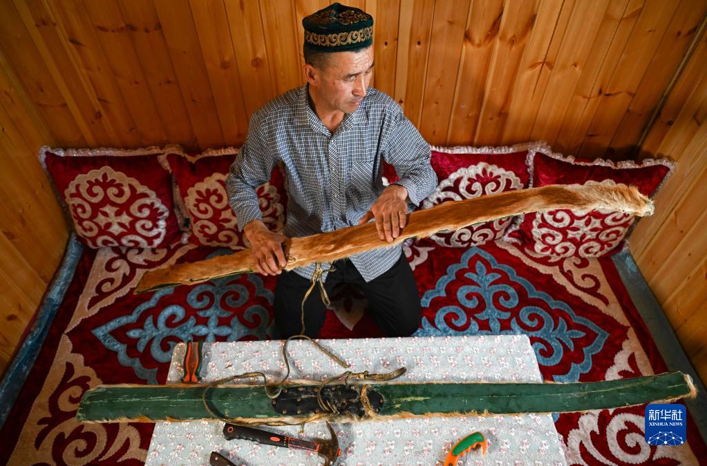 新疆阿勒泰地區富蘊縣可可托海鎮牧民赤合斯·阿斯沙汗在家中展示古老毛皮滑雪板(2022年12月22日攝)。古老毛皮滑雪板已是阿勒泰地區冰雪文旅名片。
