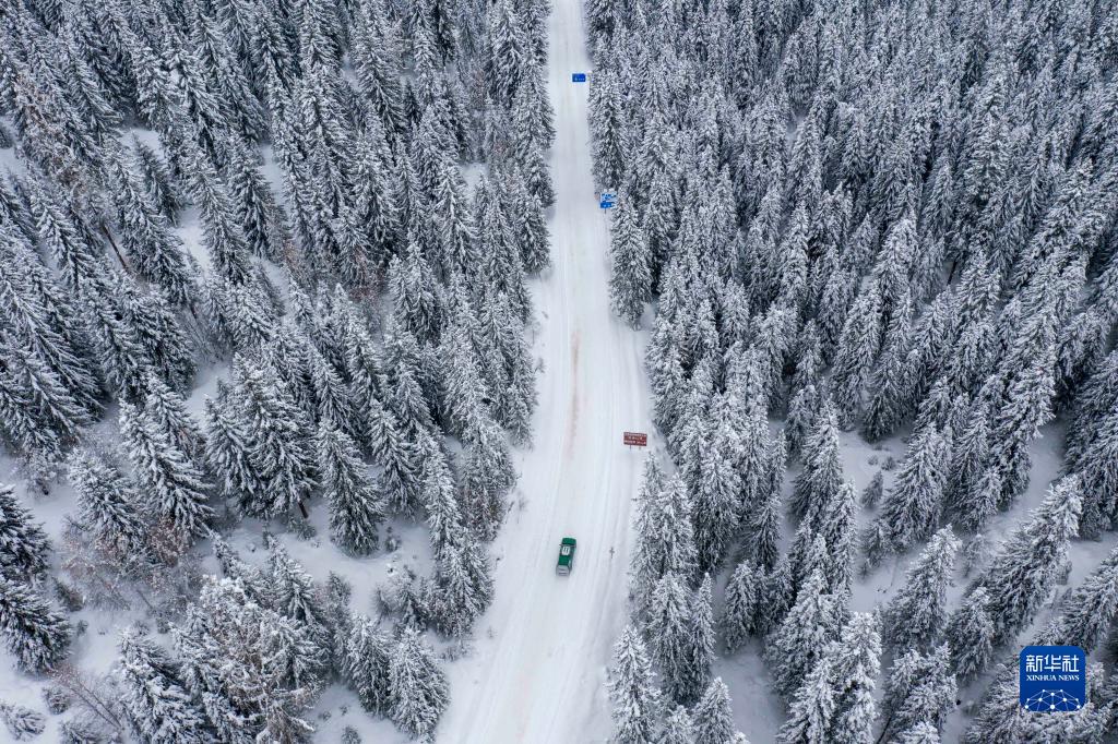 自駕游客在新疆阿勒泰地區喀納斯景區行駛(1月8日攝,無(wú)人機照片)。