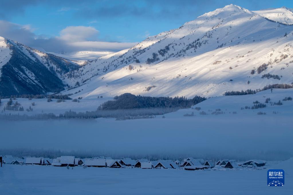 新疆阿勒泰地區禾木景區雪后初霽,薄霧籠罩村莊(1月8日攝)。
