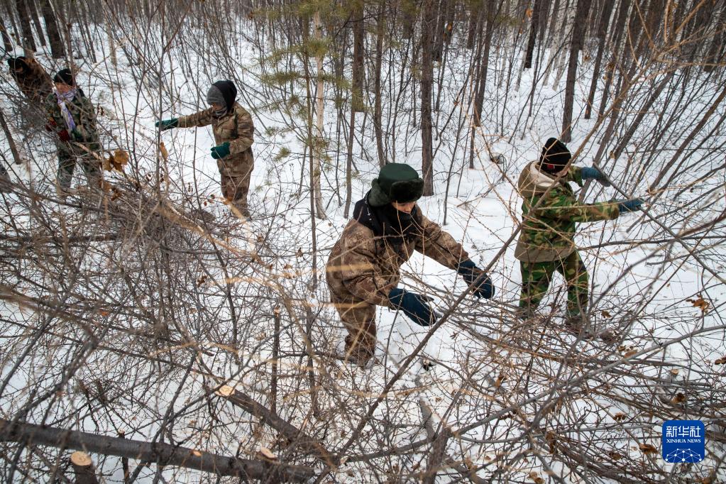 1月11日,在漠河林場(chǎng)管護區作業(yè)點(diǎn),森林撫育工人閆秀艷、龐珊珊、張杰和陳曉紅在進(jìn)行林間清理作業(yè)。