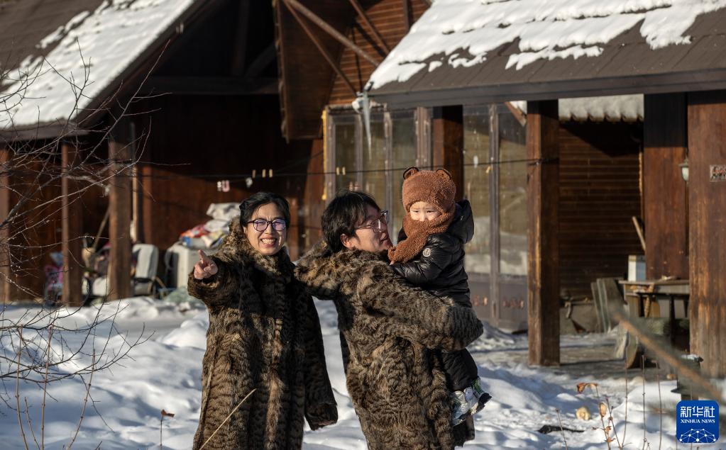 1月13日,覺(jué)樂(lè )一家三口在根河市敖魯古雅鄂溫克族鄉合影。2003年,從山上搬下來(lái)的使鹿部落都被安置在這里,兩戶(hù)一棟小樓,由政府免費提供給敖魯古雅鄂溫克人居住。新華社記者 費茂華 攝