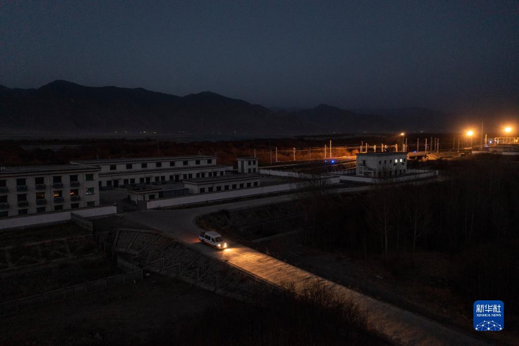 羅布和同事駕車(chē)駛出拉林鐵路扎囊工電綜合工區,趕往鋼軌探傷作業(yè)點(diǎn)(1月12日攝,無(wú)人機照片)。