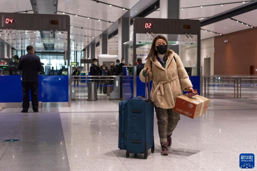 1月12日,在綏芬河公路口岸旅檢大廳,旅客辦理完通關(guān)手續入境。