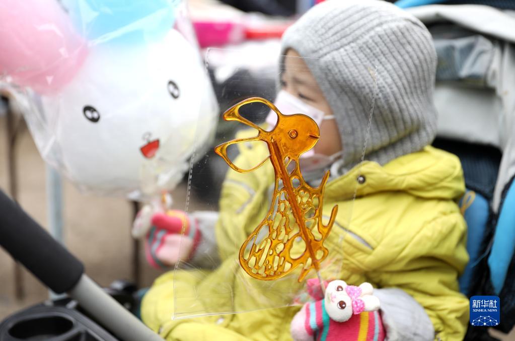 1月12日,一名小朋友拿著(zhù)兔子圖案的糖畫(huà)和棉花糖。