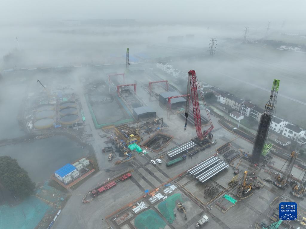 1月13日拍攝的張靖皋長(cháng)江大橋南航道橋南錨碇施工現場(chǎng)(無(wú)人機照片)。