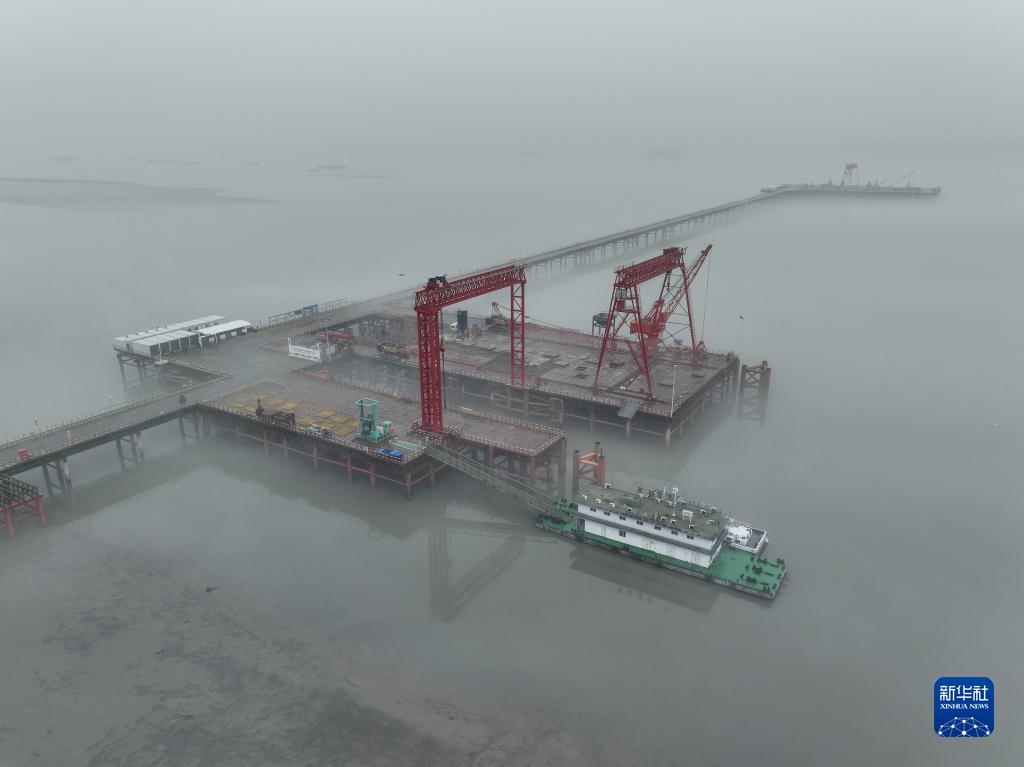 1月13日拍攝的張靖皋長(cháng)江大橋南航道橋施工現場(chǎng)(無(wú)人機照片)。