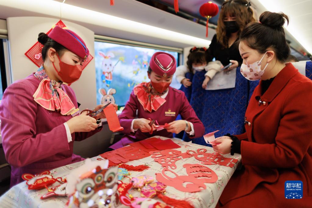 當日,在貴陽(yáng)北開(kāi)往成都南的C5980次復興號高鐵列車(chē)上,乘務(wù)員們熱情邀請旅客們參與剪窗花、貼年畫(huà)、做年糕、畫(huà)糖畫(huà)等活動(dòng)。濃濃的新春喜慶氣氛在車(chē)廂內洋溢,大家在歡聲笑語(yǔ)中一起迎接即將到來(lái)的小年。