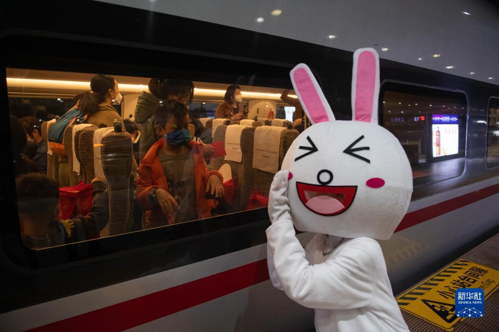 當日,G1008次愛(ài)心專(zhuān)列搭載著(zhù)500多名長(cháng)期在深圳工作的文明實(shí)踐志愿者從深圳北站駛往武漢。G1008次列車(chē)是深圳鐵路部門(mén)今年春運開(kāi)出的第6趟愛(ài)心專(zhuān)列,暖心助力深圳地區的文明實(shí)踐志愿者和城市奮斗者及家人順利回家過(guò)年。新華社記者 毛思倩 攝