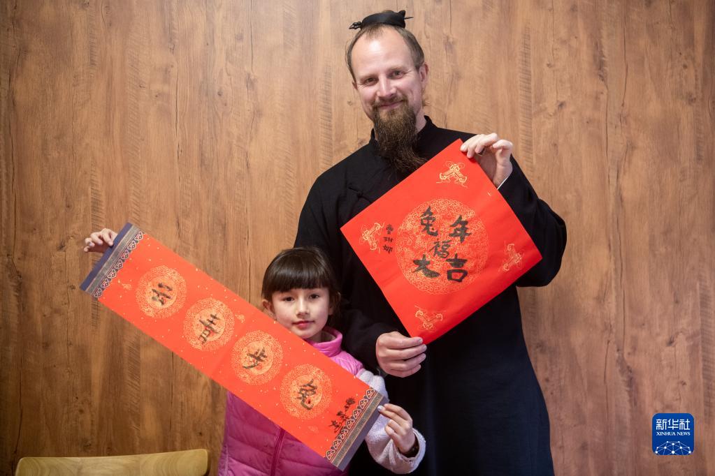 1月12日,杰克和女兒展示自己寫(xiě)的春聯(lián)和福字。