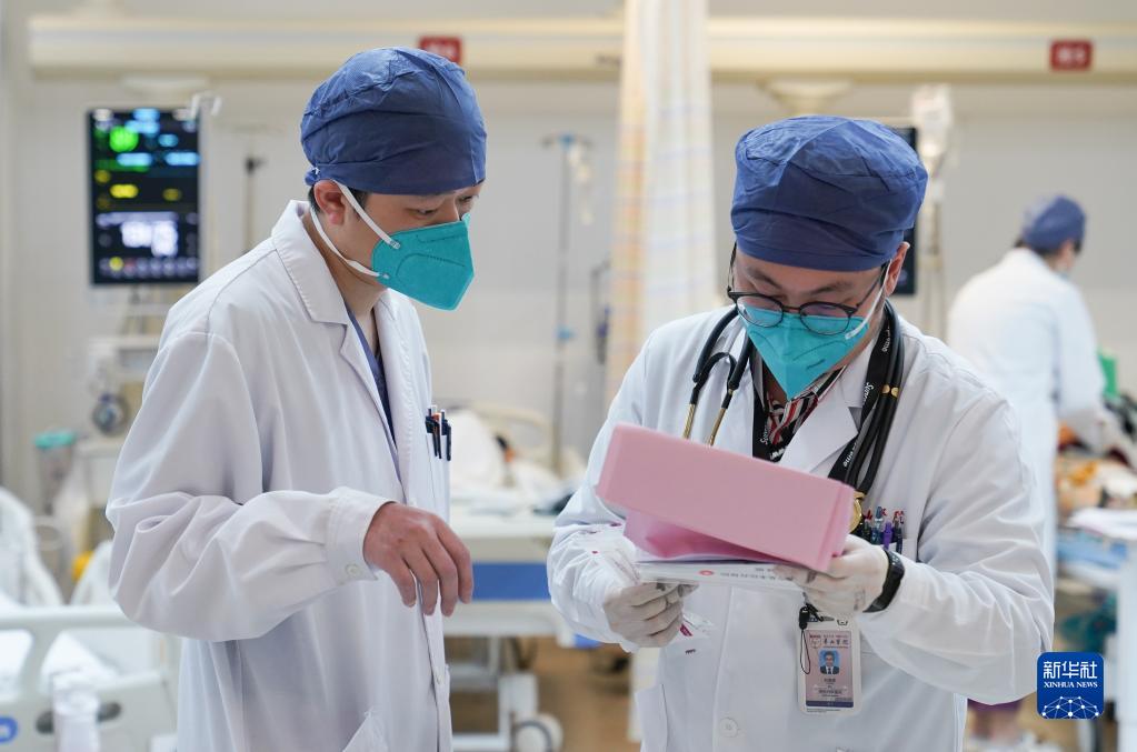 1月7日,在復旦大學(xué)附屬華山醫院虹橋院區急診搶救室,醫生劉逸奇(右)和同事討論患者病情。