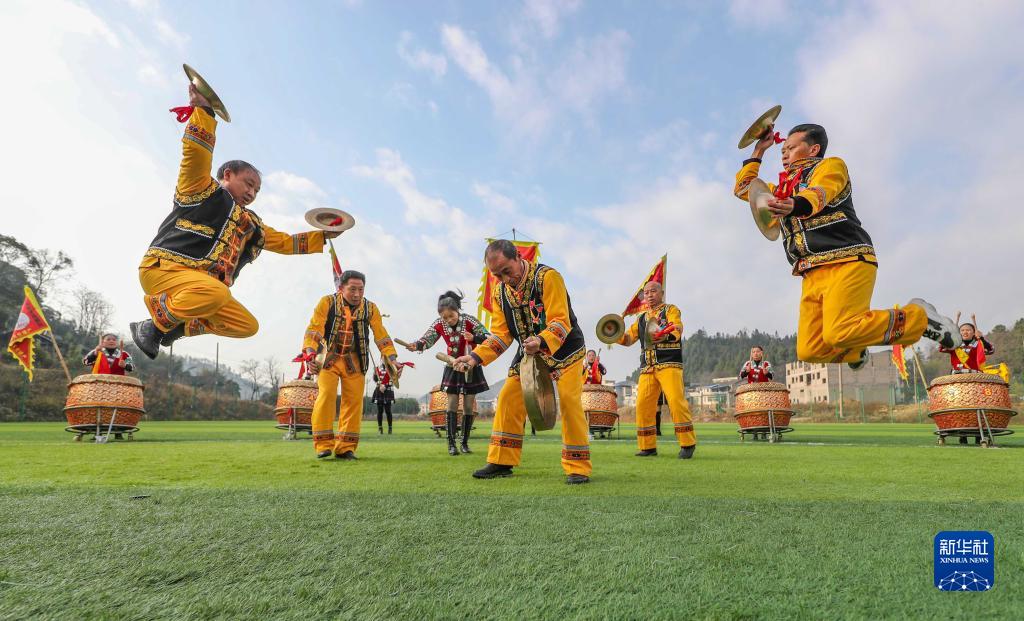 春節臨近,貴州省黔東南苗族侗族自治州岑鞏縣天馬鎮天馬村的民間藝人表演“思州戰鼓”,迎接新春佳節。