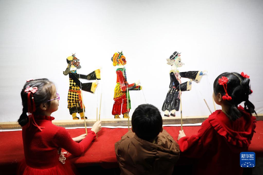 1月13日,在唐山市豐潤區文化館,小朋友在表演皮影戲。
