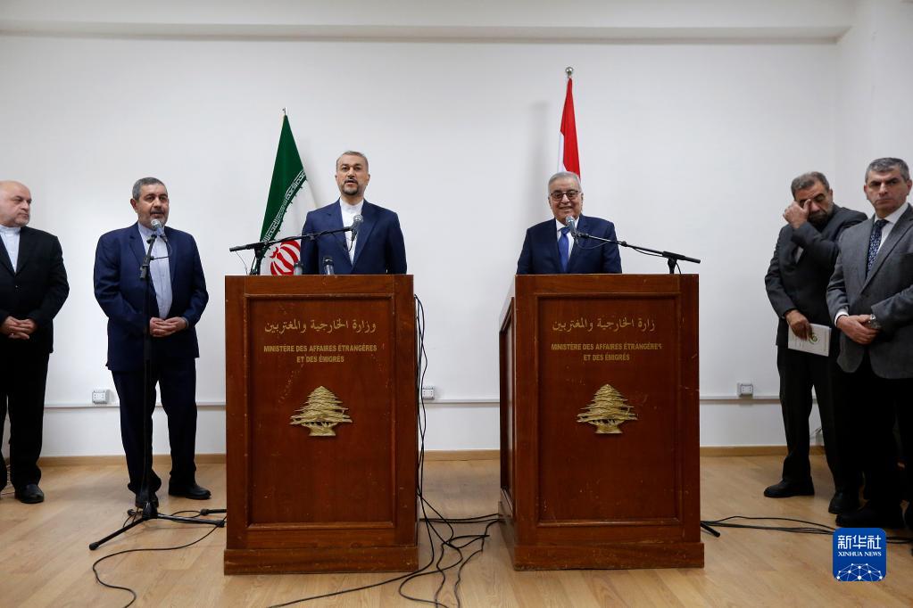 1月13日,在黎巴嫩貝魯特,伊朗外長(cháng)阿卜杜拉希揚(中左)和黎巴嫩外長(cháng)哈比卜(中右)共同出席新聞發(fā)布會(huì )。