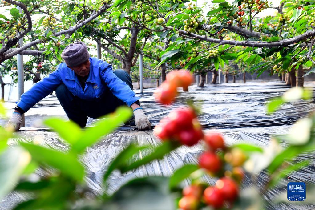 1月14日,在五蓮縣戶(hù)部鄉果樹(shù)大本營(yíng),工作人員在管護設施大棚里的櫻桃。