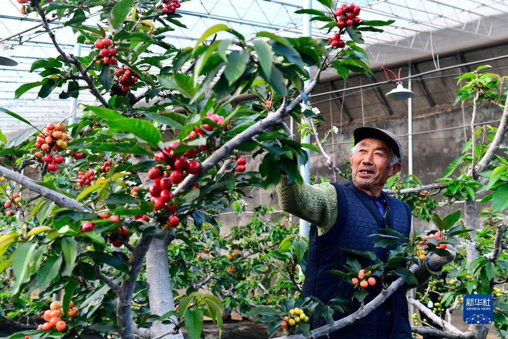 1月14日,在五蓮縣戶(hù)部鄉果樹(shù)大本營(yíng),工作人員在管護設施大棚里的櫻桃。