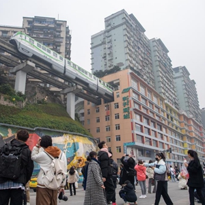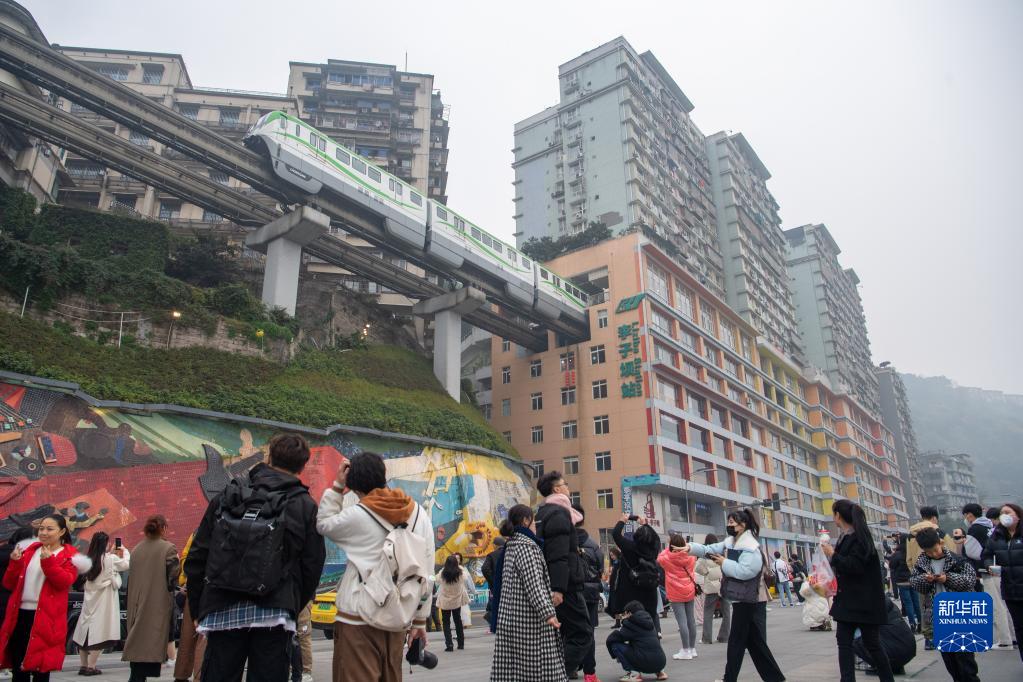1月13日,在位于重慶市渝中區的軌道交通李子壩站附近,游客在觀(guān)看、拍攝“穿樓而過(guò)”的列車(chē)。
