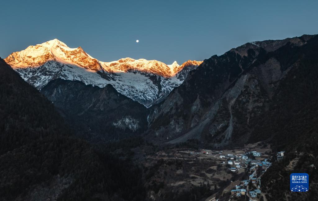1月9日在雨崩村拍攝的梅里雪山“日照金山”景象(無(wú)人機照片)。