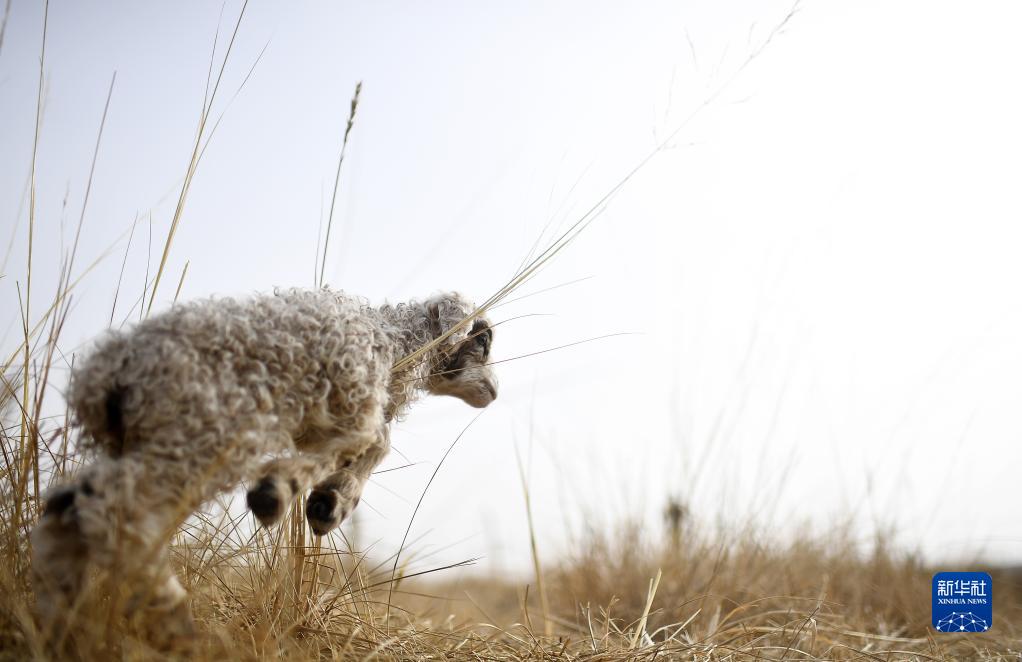 1月13日,在青海湖湖東種羊場(chǎng),一只羊羔在冬季草場(chǎng)奔跑。